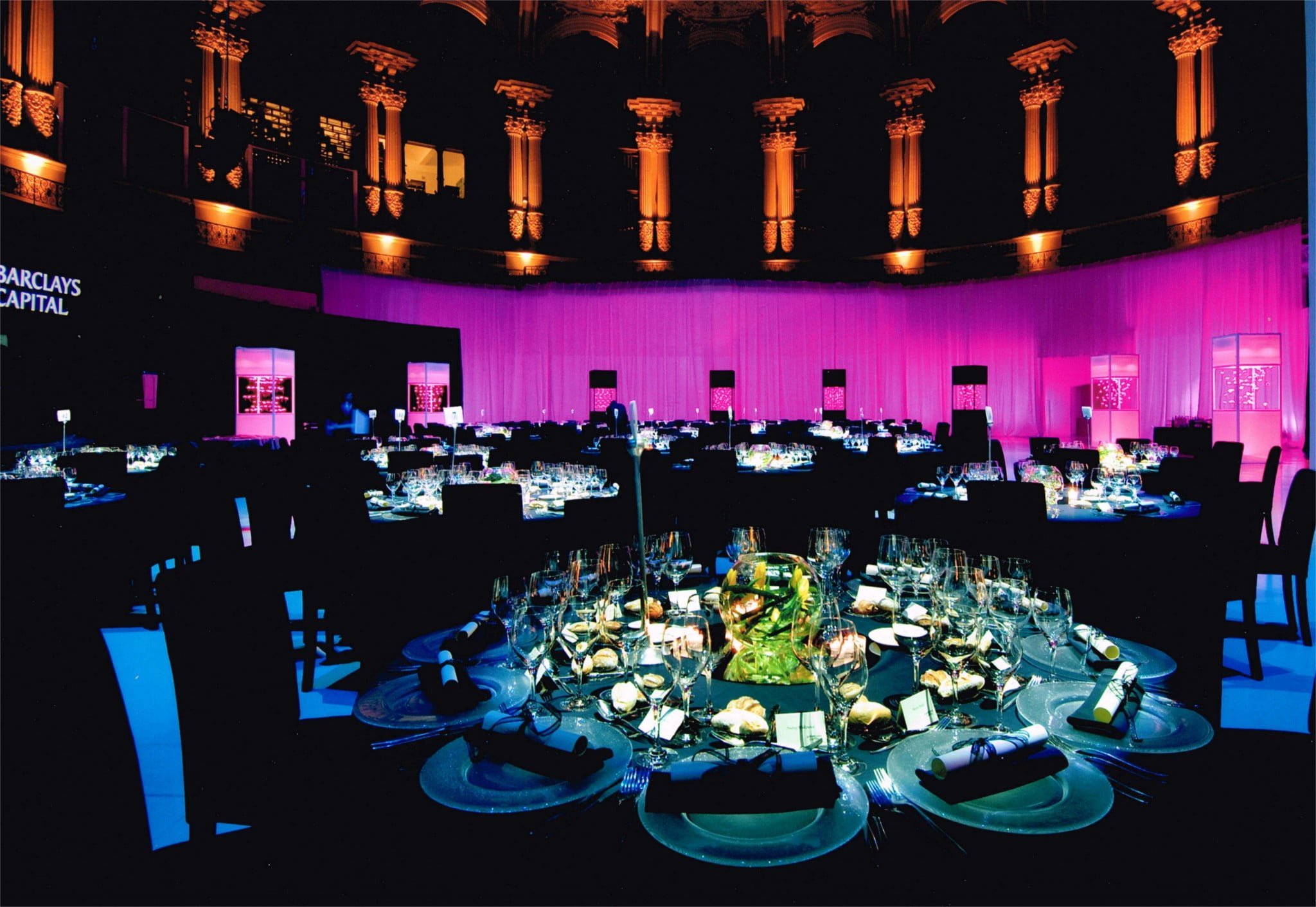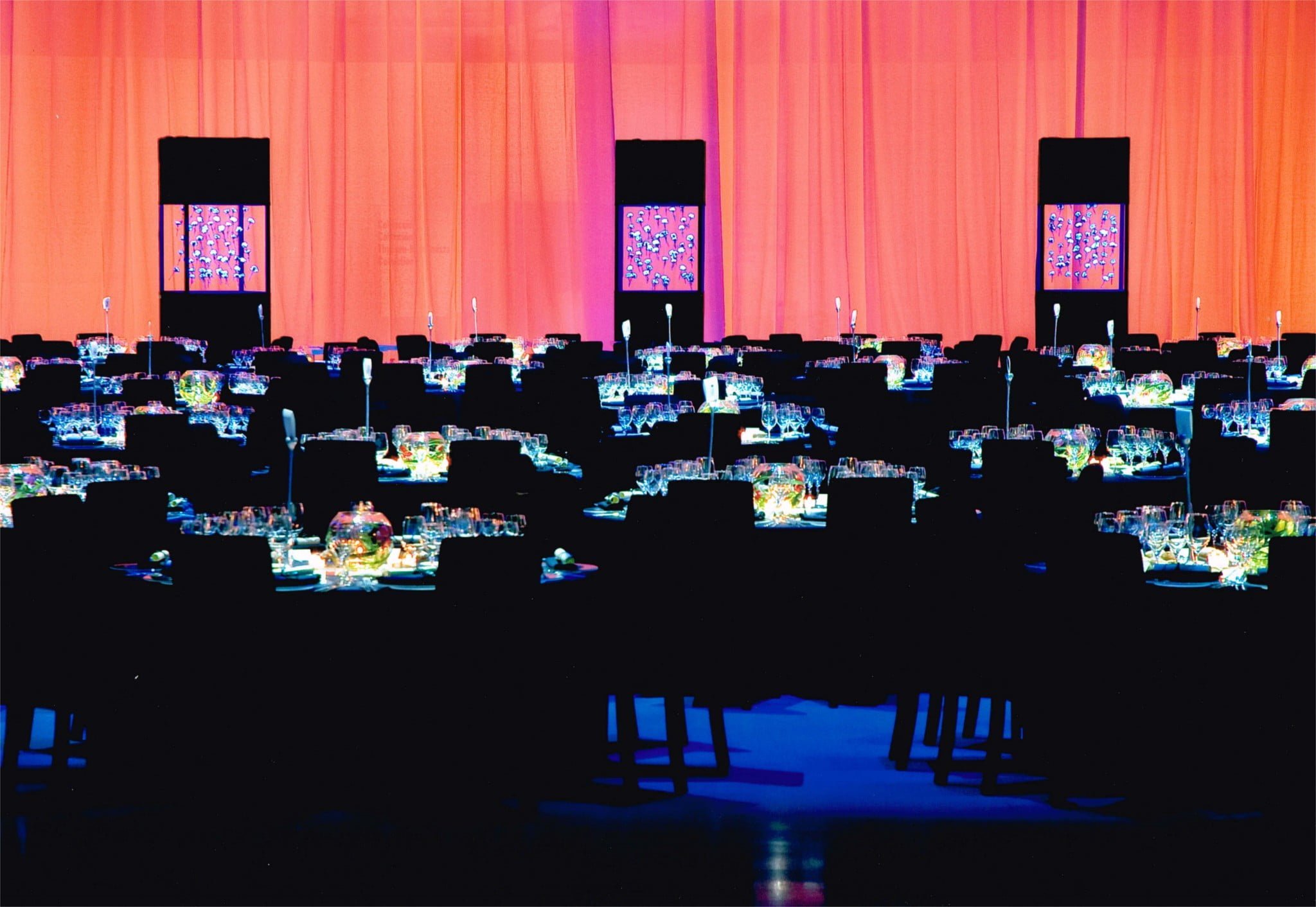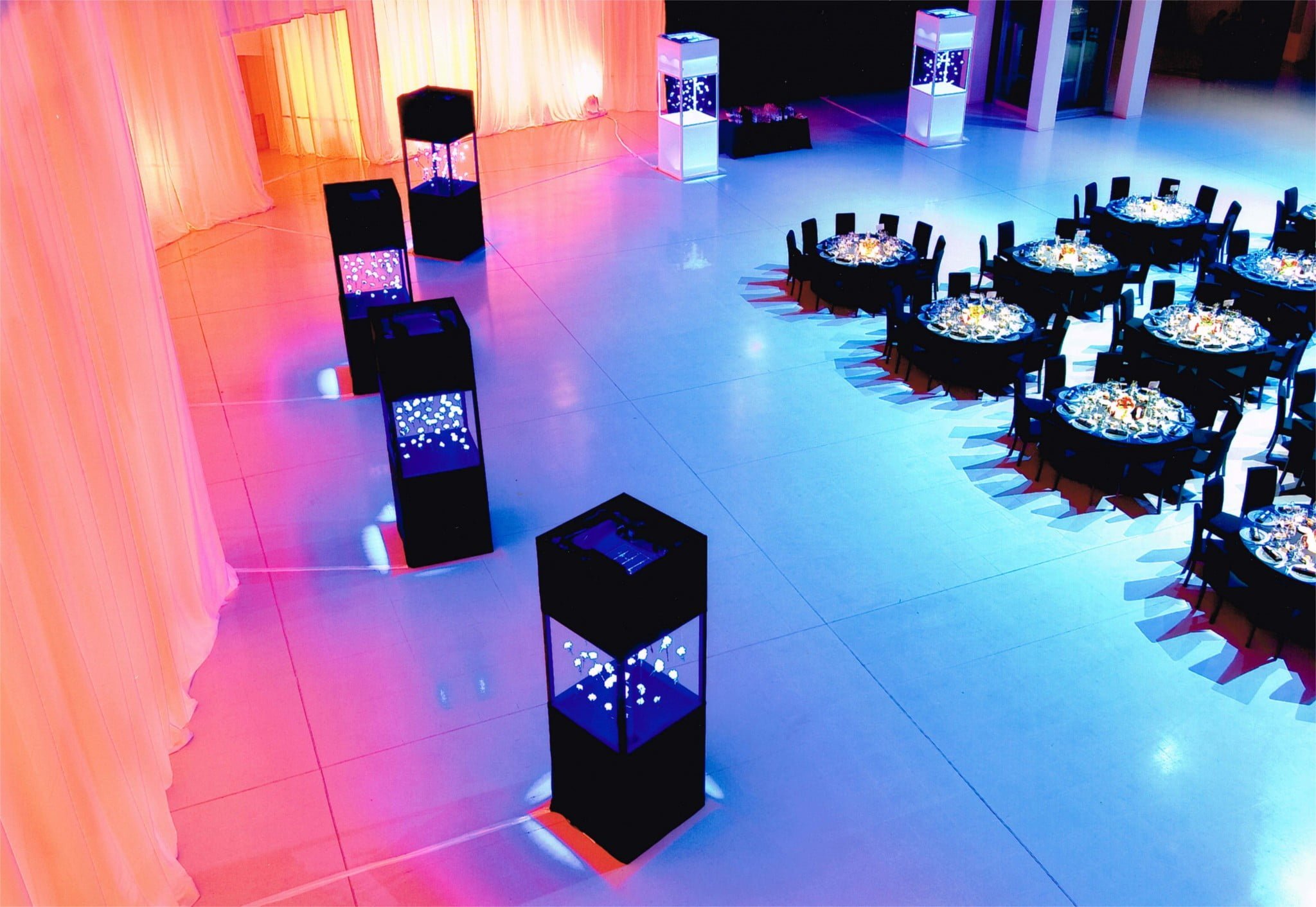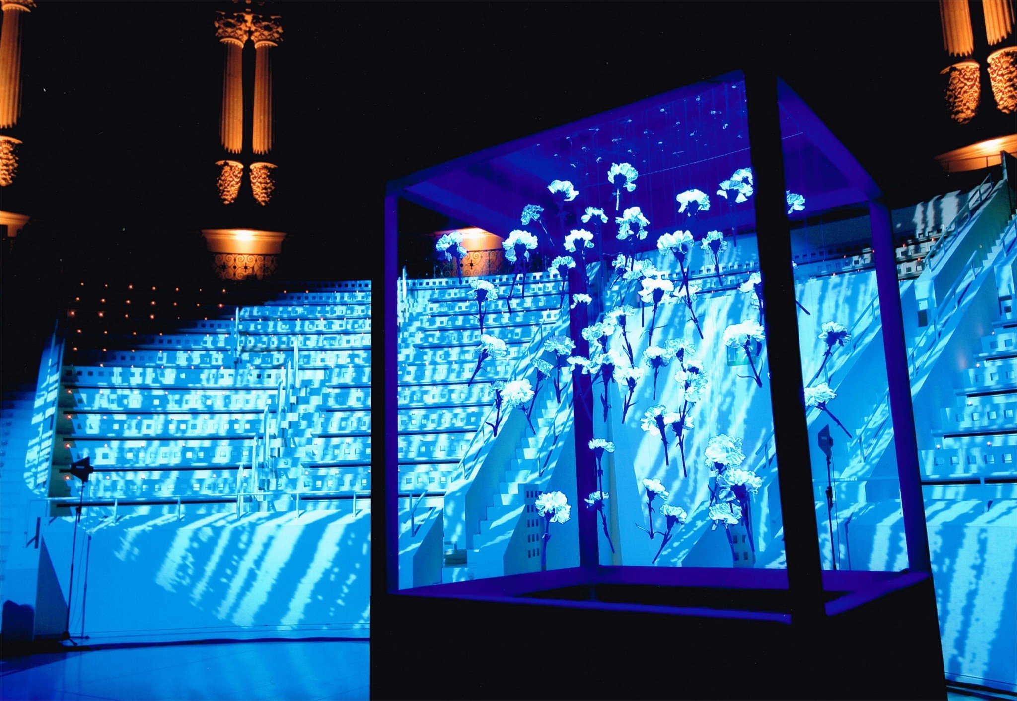 There was no script from the company, just logos, speeches and conferences. We were asked to bring something new to the event, to avoid the rigidity and sobriety of congresses. We focused on Barclays' corporate blue and let our imagination and creativity run wild. This is how we came up with the idea of 'magic boxes'. We created black and white boxes, as if they were display stands, with white flowers cascading from them, illuminated by LEDs that changed colour during the event, creating incredible chromatic effects as if by magic.