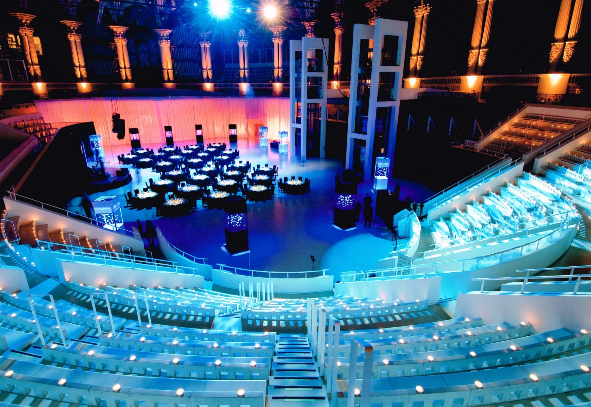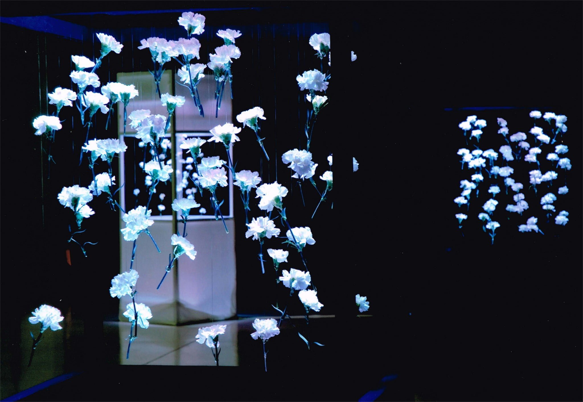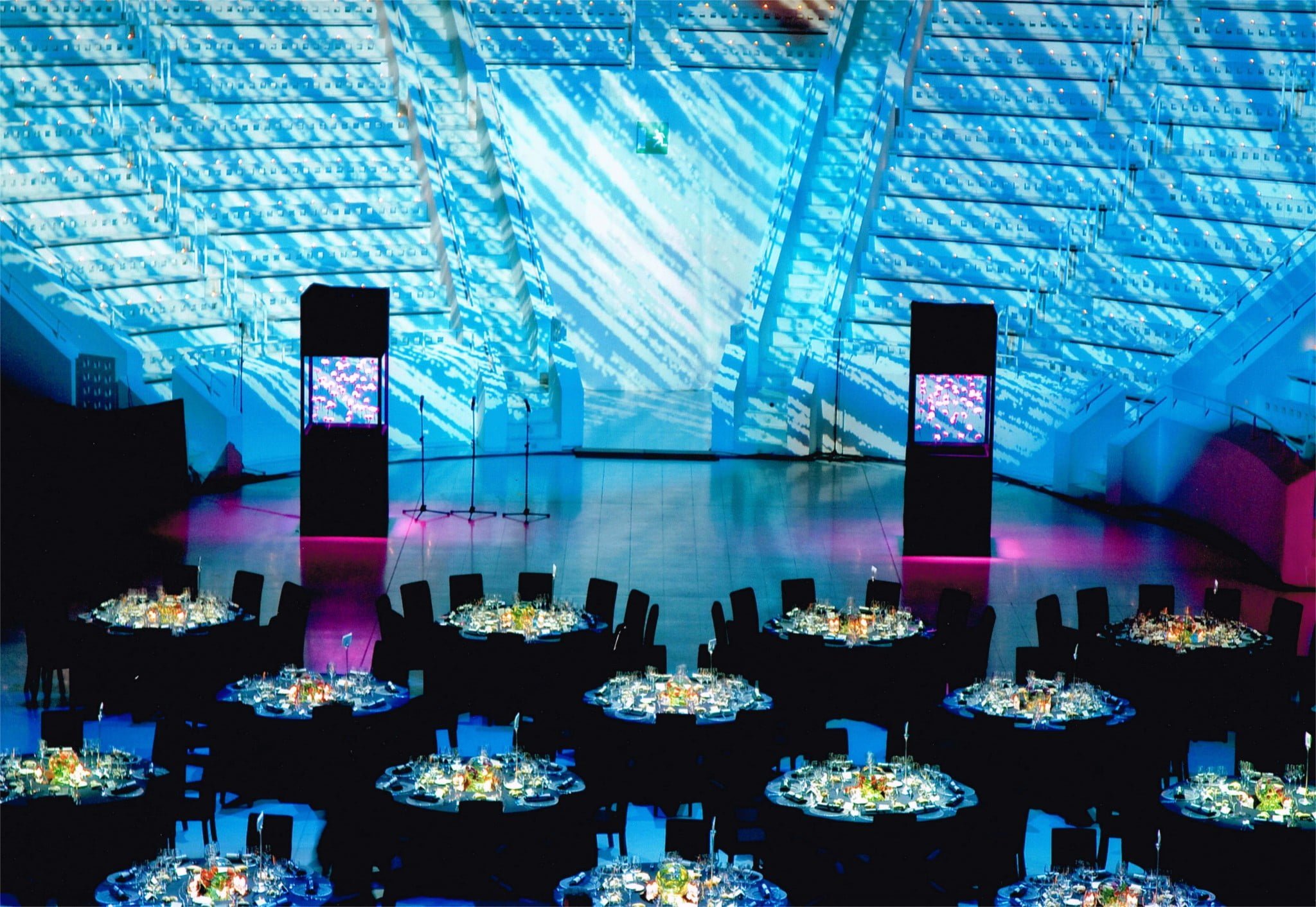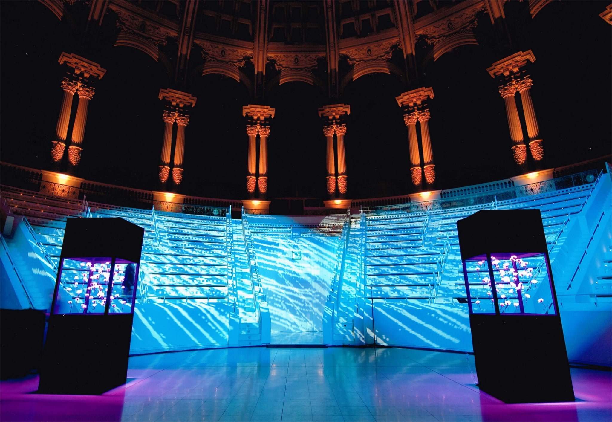 There was no script from the company, just logos, speeches and conferences. We were asked to bring something new to the event, to avoid the rigidity and sobriety of congresses. We focused on Barclays' corporate blue and let our imagination and creativity run wild. This is how we came up with the idea of 'magic boxes'. We created black and white boxes, as if they were display stands, with white flowers cascading from them, illuminated by LEDs that changed colour during the event, creating incredible chromatic effects as if by magic.