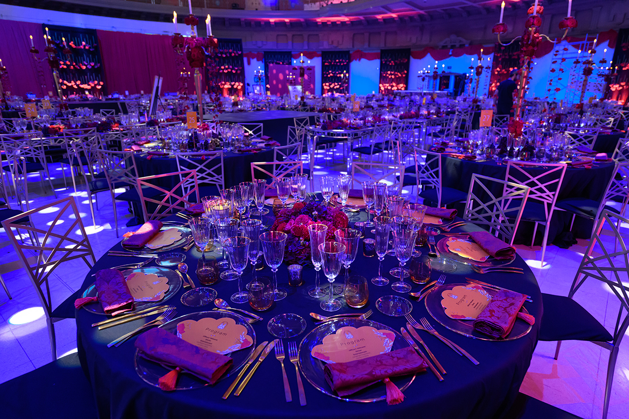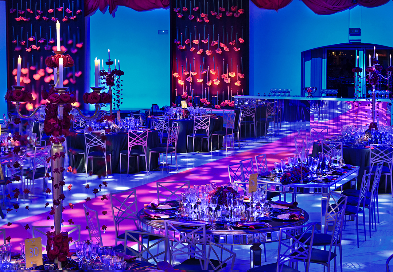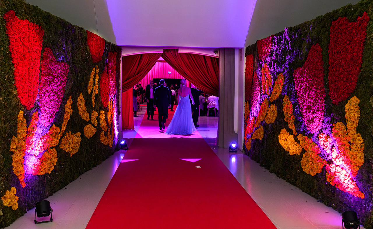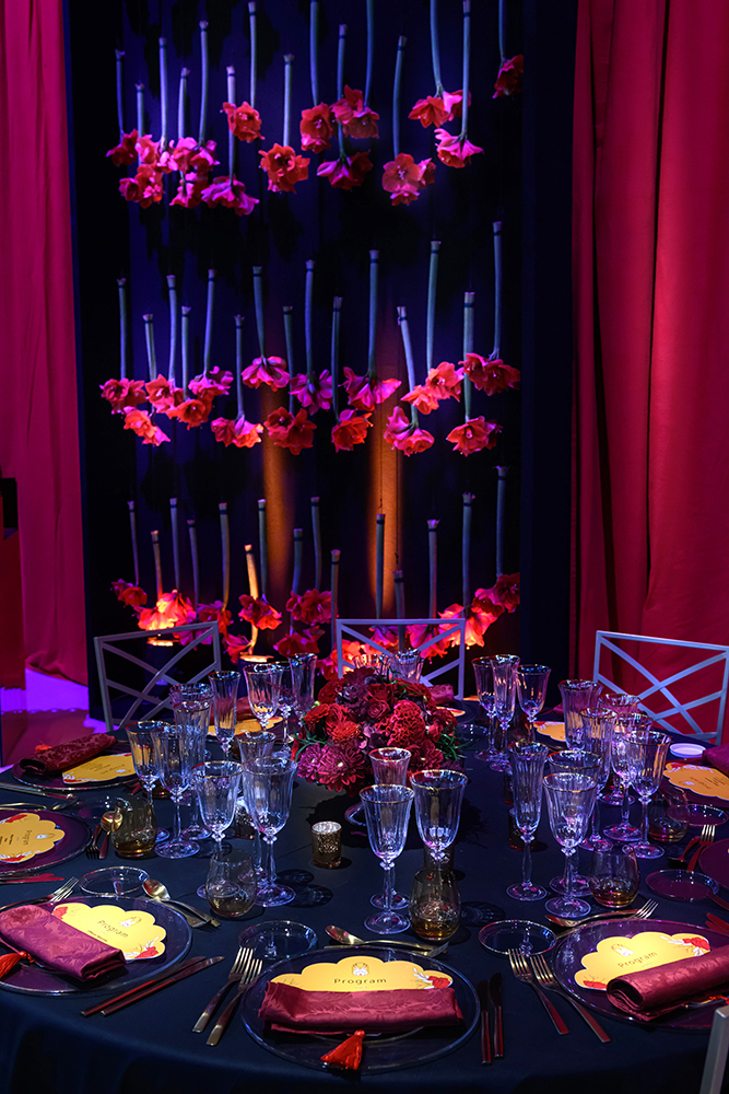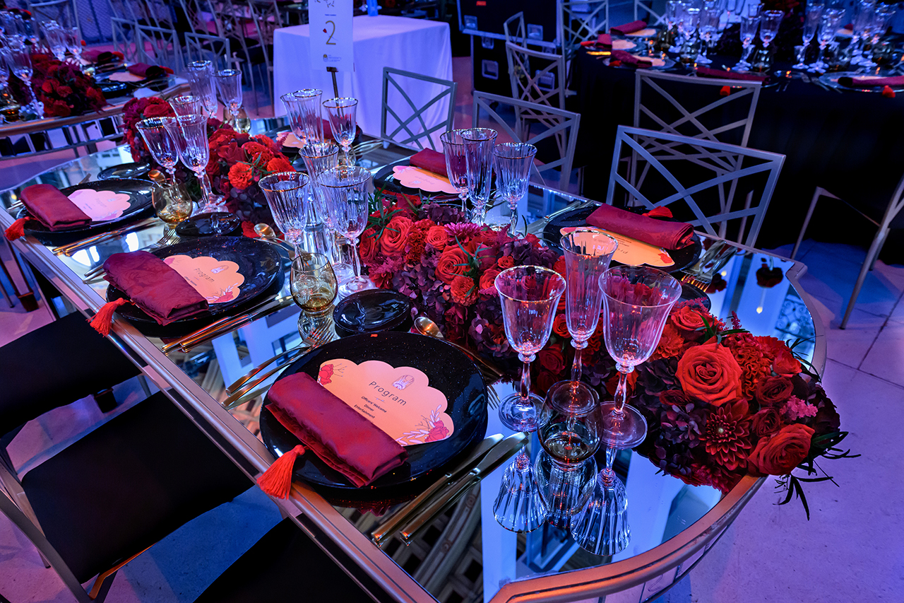 Las protagonistas de este evento fueron las rosas suspendidas de candelabros estratégicamente situados sobre las mesas. Esta disposición de elementos no solo complementó la estética del lugar, sino que también produjo una conexión entre la distribución artística del museo y la exquisitez culinaria.